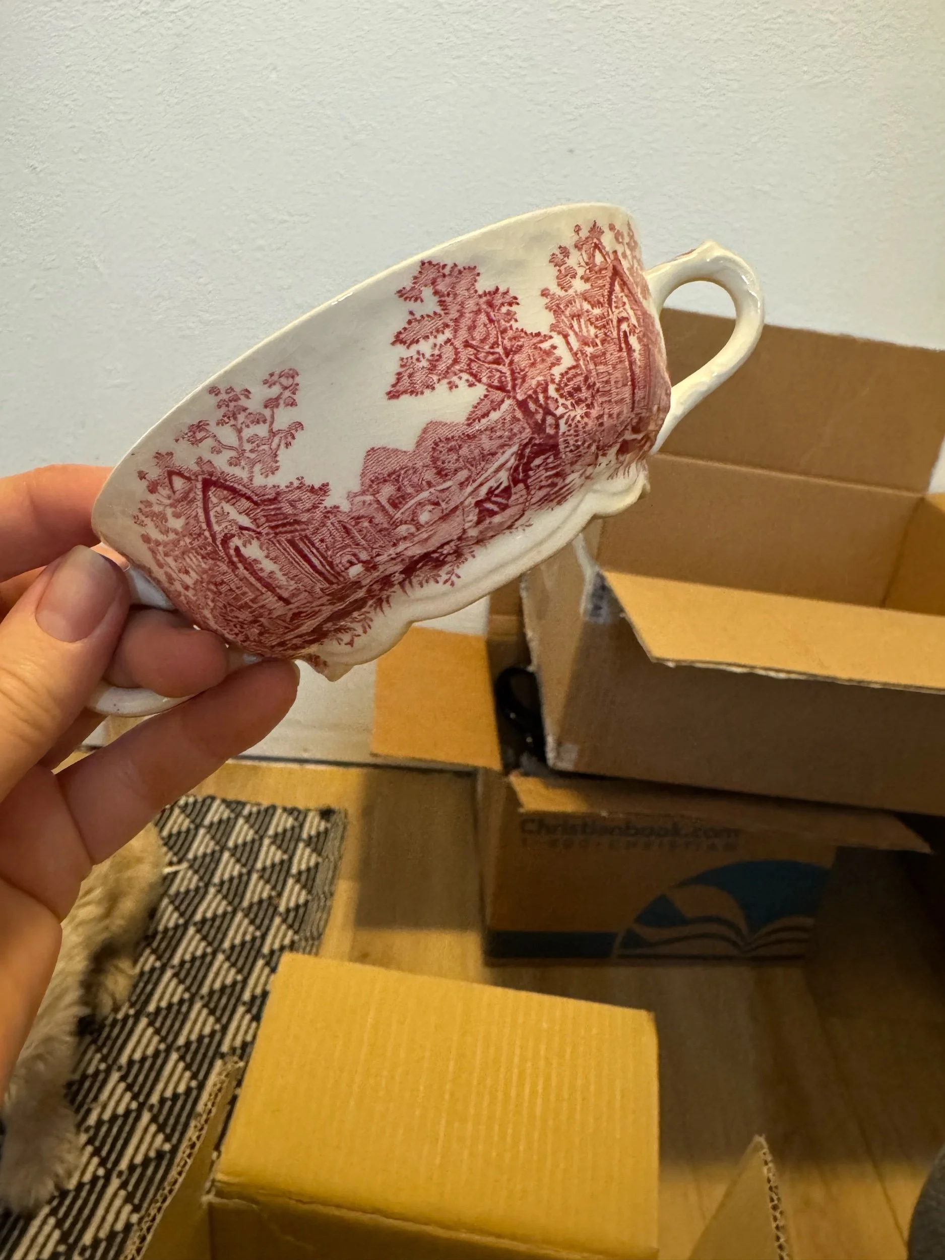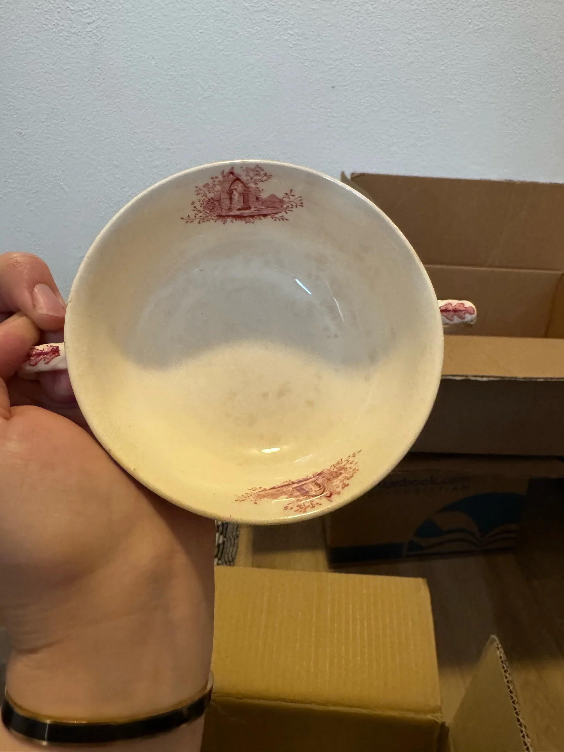This specific piece is a two-handled earthenware bowl featuring a classic red transferware design of an English abbey and landscape. While it shares visual similarities with patterns like Mason's "Vista" or Enoch Wedgwood's "Lochs of Scotland", the specific building illustrations and scalloped base are characteristic of the TS&T English Abbey line.
