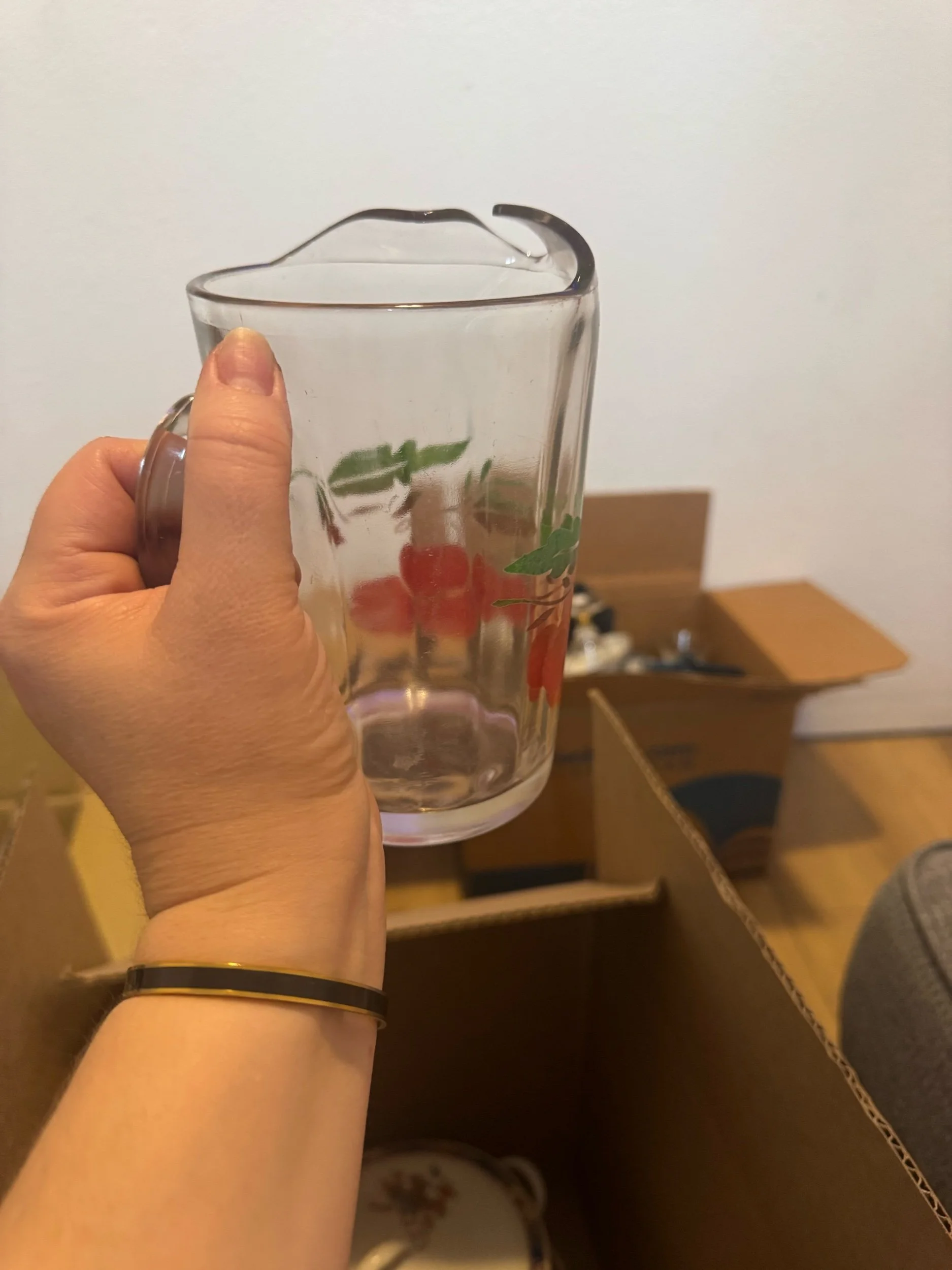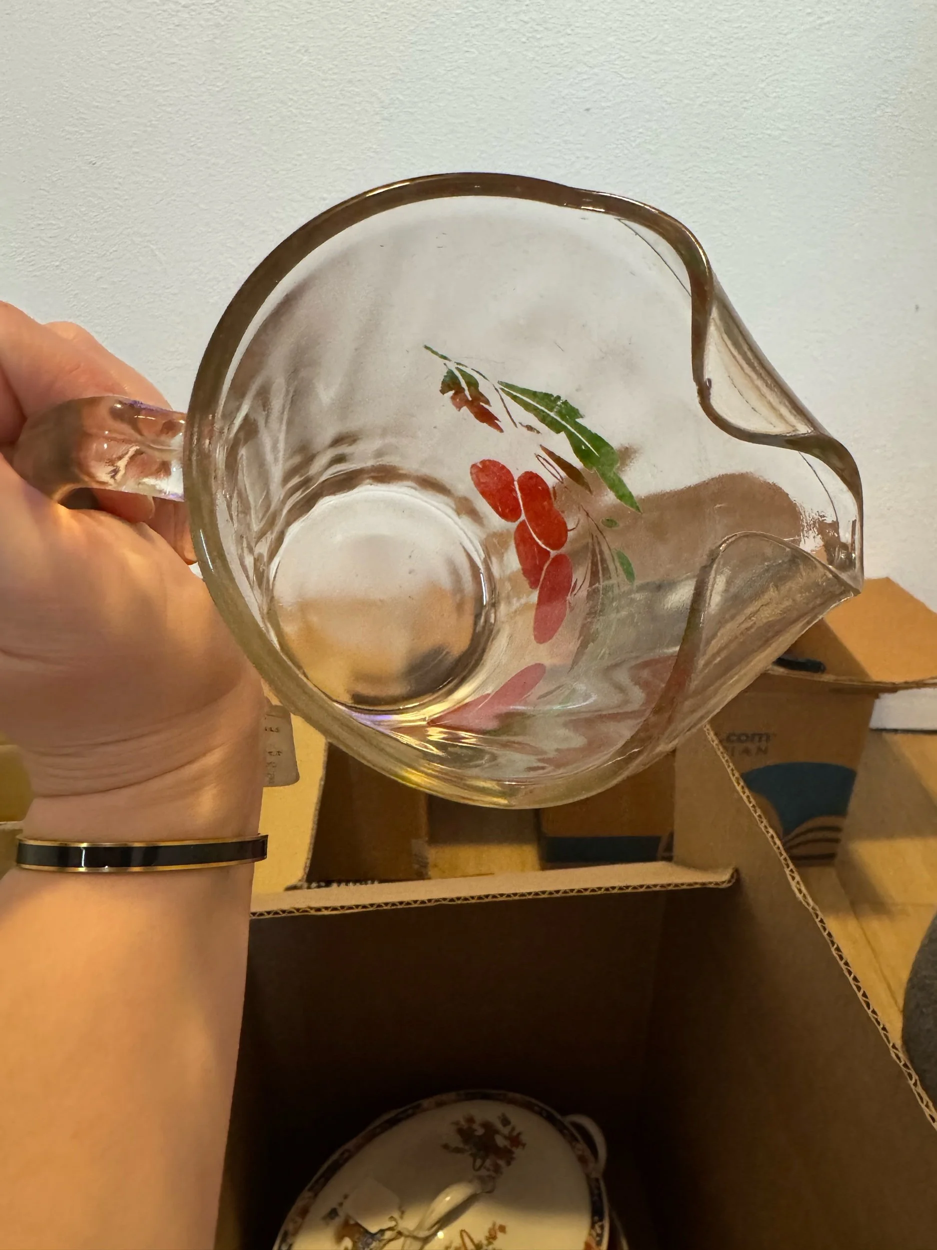 vintage glass juice pitcher, commonly produced in the mid-20th century. Based on similar listings, these pitchers were often used specifically for tomato juice or cherry juice and frequently featured an ice lip to prevent ice from splashing into glasses.