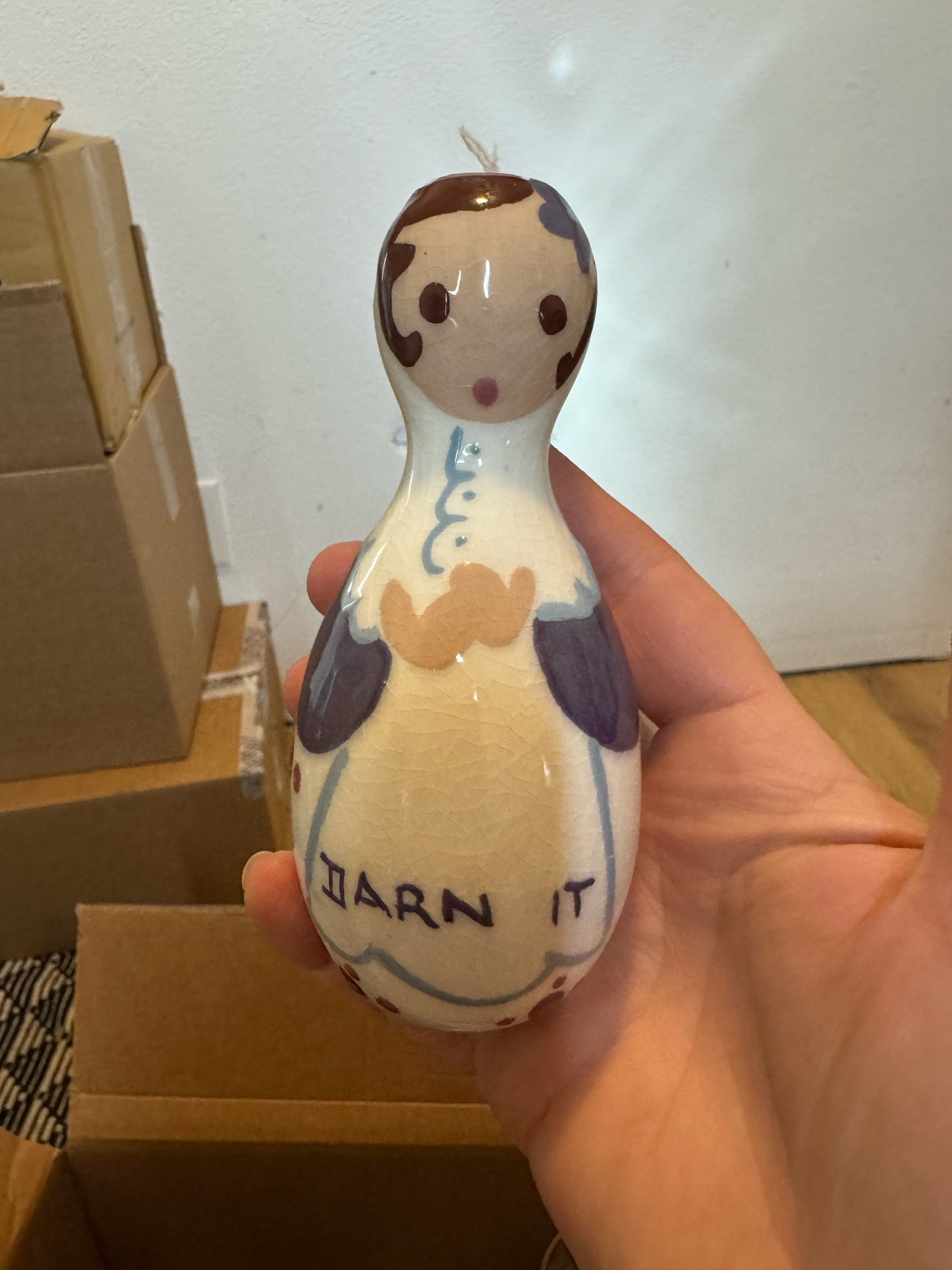This item is a Cleminson Pottery "Darn It" doll, a vintage ceramic sewing tool known as a darning egg.
